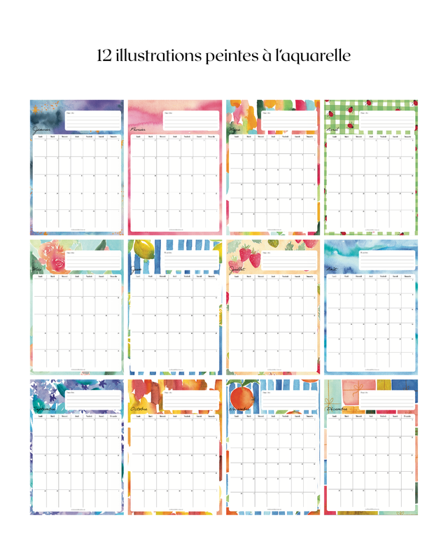 - Calendrier 13 pages (couverture + 1 page par mois)